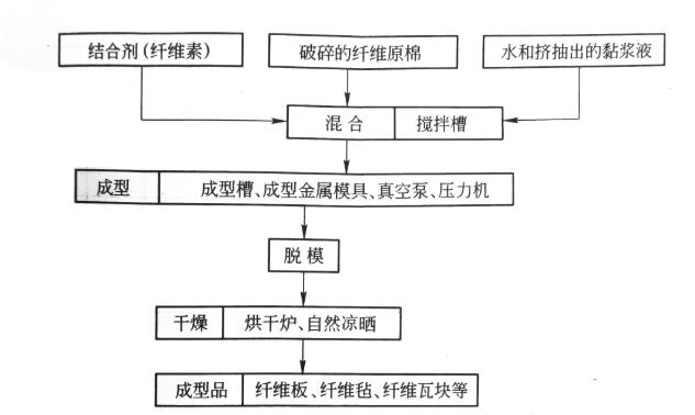 所謂陶瓷纖維板的濕法真空成型工藝,首先將纖維原棉切割成適合級配的碎塊,混配成漿狀放入定尺的金屬模內(nèi),金屬模壁上設(shè)有排水的小孔并與真空泵相連。金屬模內(nèi)襯要放入尼龍網(wǎng)紗,以便在擠壓和抽真空時擋住纖維棉溢出。成型產(chǎn)品的厚度可根據(jù)抽力和擠壓力來調(diào)節(jié),工藝如下圖。